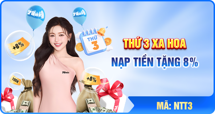 Tất cả các thành viên của 78Win f khi tham gia nạp tiền vào ngày Thứ 3 hàng tuần có thể tham gia nhận thưởng 8% tiền nạp, mỗi tuần một lần, chỉ cần hoàn thành 2 vòng cược là có thể rút tiền.
